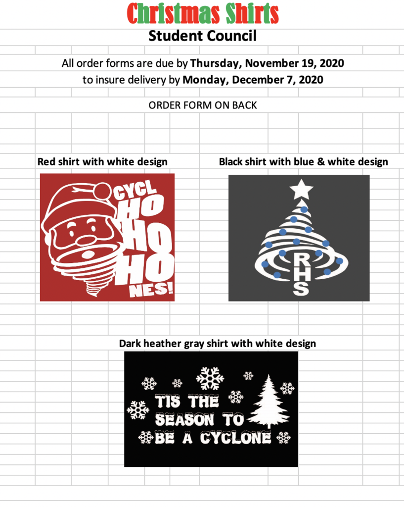 Get in the holiday spirit by ordering a Cyclone Christmas shirt from the High School Student Council--2 new designs! Order forms and money can be turned in to the offices at either East or West campus. Orders are due Friday, November 12.